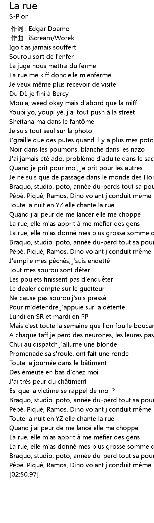 | [02:35.44] | La rue, elle m' as donne mes plus grosse somme d' argent |
