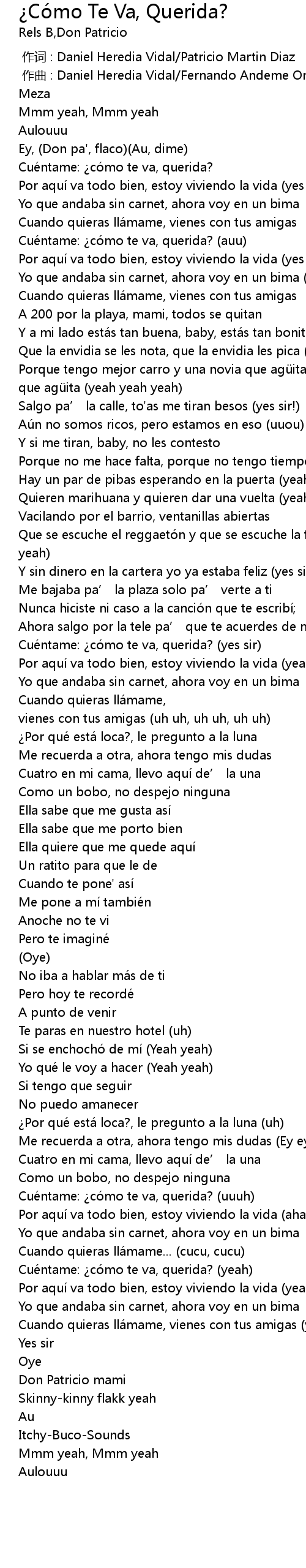 | [02:55.21] | Cué ntame: có mo te va, querida? yeah |