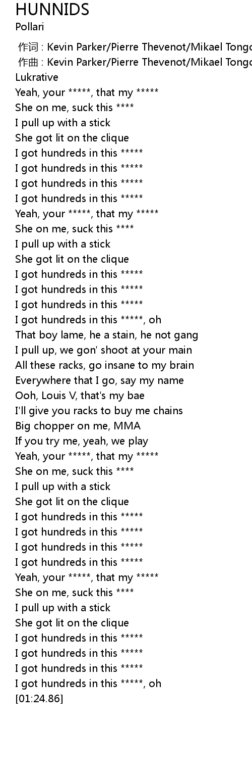 | [00:59.90] | Yeah, your *****, that my ***** |
