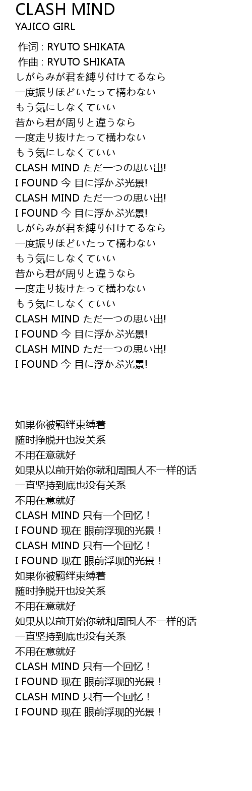 | [02:06.188] | CLASH MIND ただ一つの思い出! |