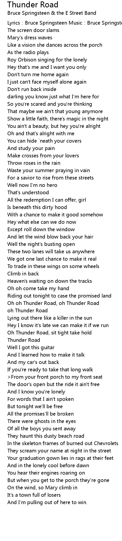 | Oh oh Thunder Road, oh Thunder Road | |