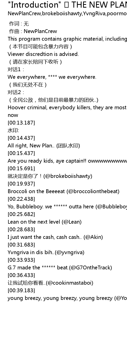 | [00:14.437] | All right, New Plan.. tuan dui shui yin |