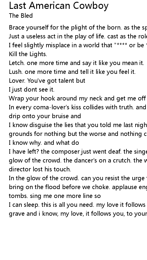 In the glow of the crowd. can you resist the urge to burn the script we wrote? bring on the flood before we choke. applause engulfs the room. we bow into our tombs. sing me one more line so |