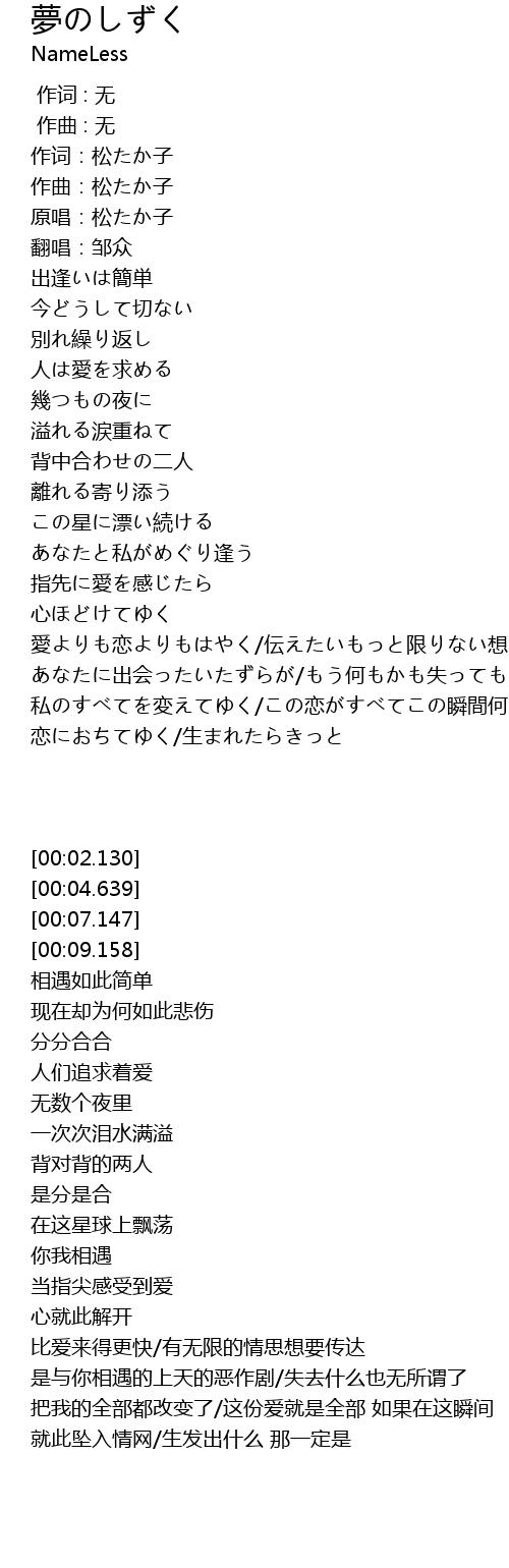 | [01:45.756] | 私のすべてを変えてゆく/この恋がすべてこの瞬間何かが |