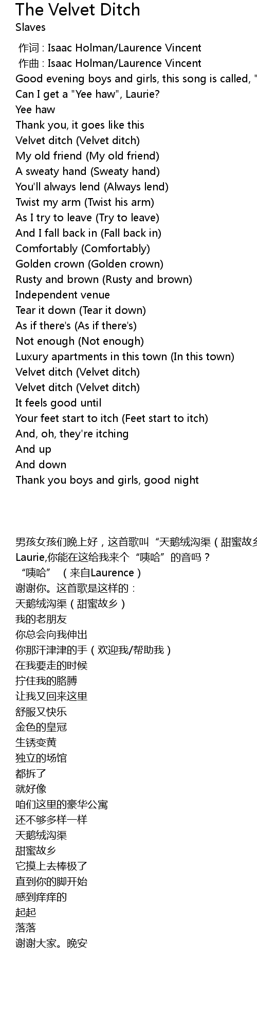 | [00:25.80] | Velvet ditch (Velvet ditch) |