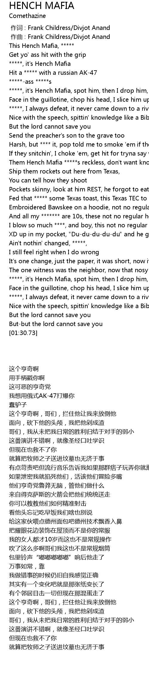 | [00:12.73] | *****, it's Hench Mafia, spot him, then I drop him, bruh |