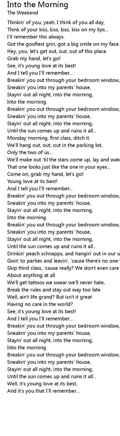 Stayin' out all night, into the morning, |