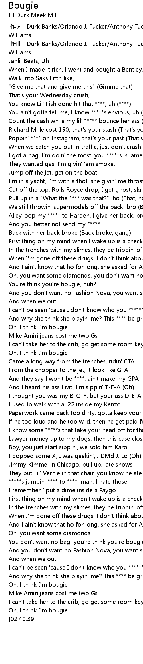 | [00:10.20] | When I made it rich, I went and bought a Bentley, ***** (*****) |