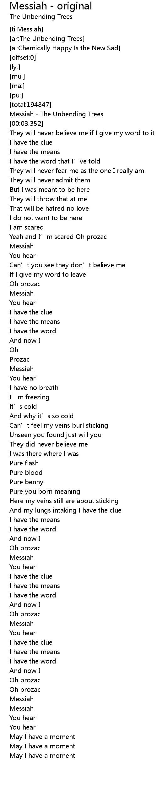 | [00:00.113] | Messiah The Unbending Trees |