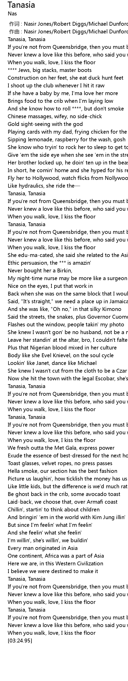| [03:06.62] | If you' re not from Queensbridge, then you must be from Asia |