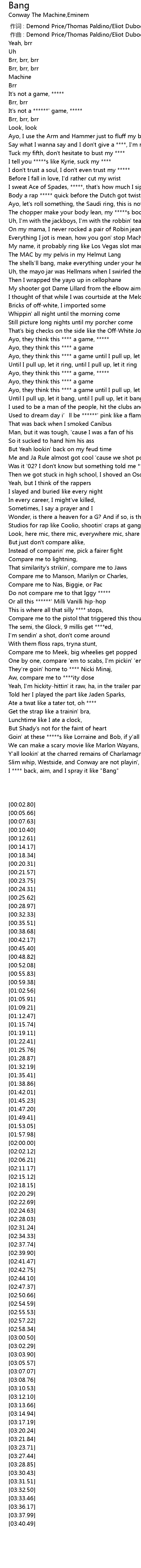 | [00:01.00] | 作曲 : Demond Price/Thomas Paldino/Eliot Dubock/Eminem/Luis Resto |