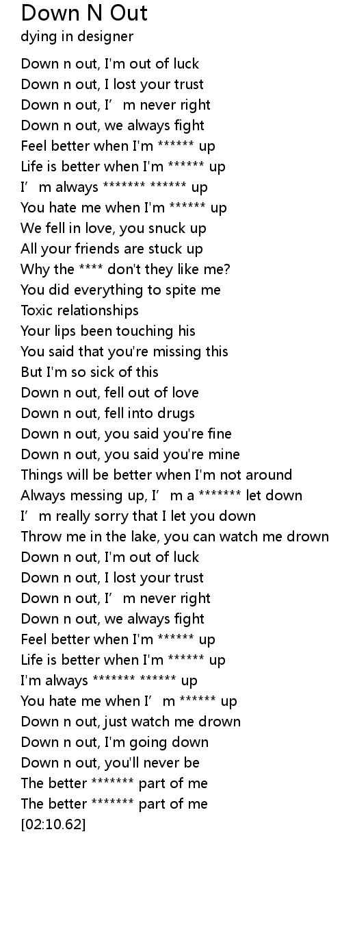 | [01:14.14] | Always messing up, I’m a ******* let down |