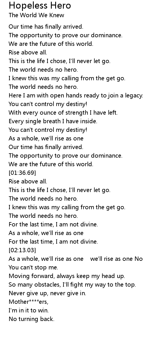 [02:14.90] As a whole, we'll rise as one we'll rise as one No turning back.