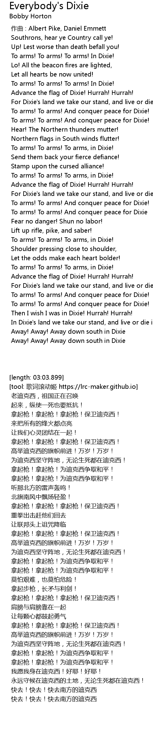 | [00:56.643] | For Dixie' s land we take our stand, and live or die for Dixie! |