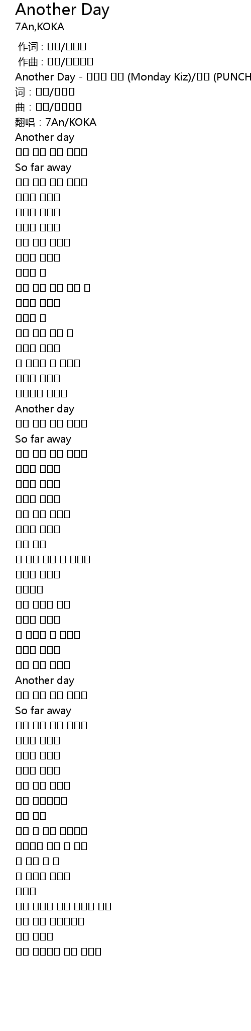 | [00:00.87] | Another Day - 먼데이 키즈 (Monday Kiz)/펀치 (PUNCH) |