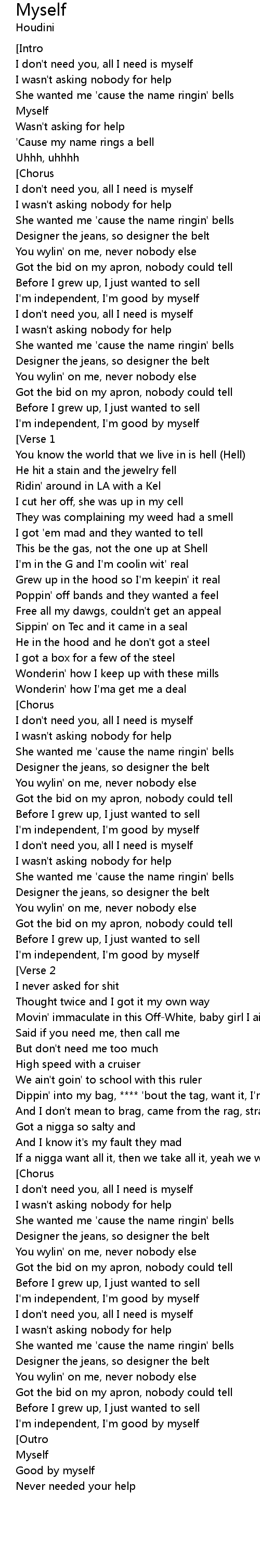 | [01:35.49] | I'm independent, I'm good by myself |