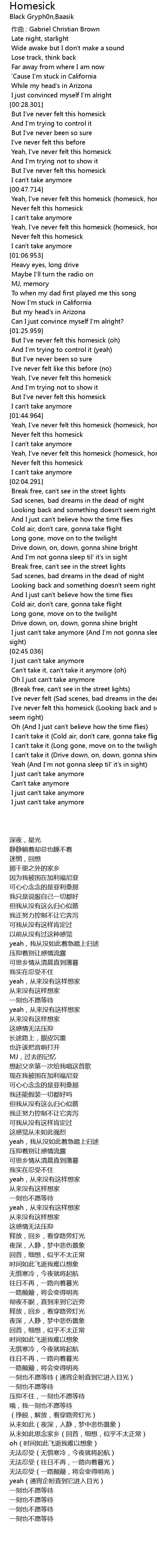 | [01:45.807] | Yeah, I' ve never felt this homesick homesick, homesick |