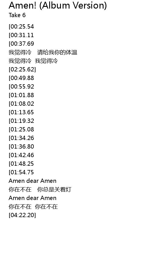 | [03:49.79][01:54.75] | Amen Amen |