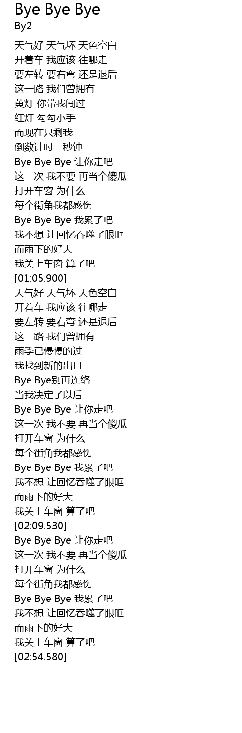 | [02:38.850] | Bye Bye Bye wǒ lèi le ba |