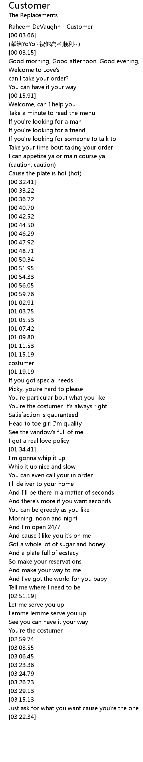 | [02:01.62][00:59.76] | Just ask for what you want cause your the costumer |