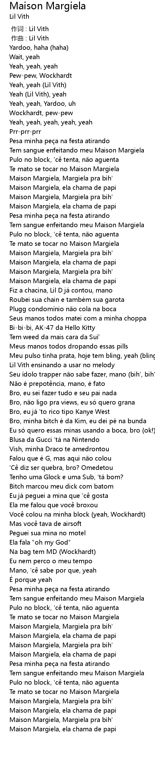 | [00:46.33] | Maison Margiela, Margiela pra bih' |
