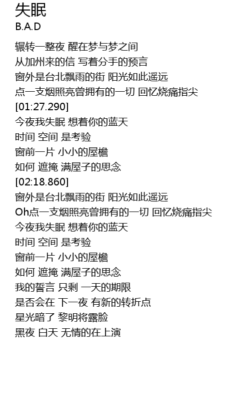 | [01:28.070] | 今夜我失眠 想着你的蓝天 |