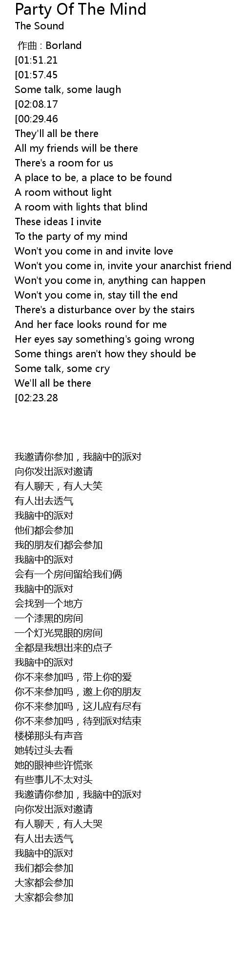 | [00:01.19][01:51.21] | I invite you to the party of my mind |