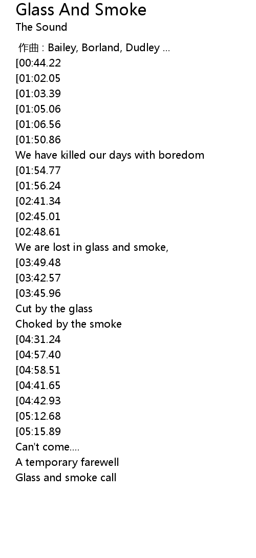| [02:27.21][02:41.34][05:55.73][06:09.70][06:23.94] | When glass and smoke call |