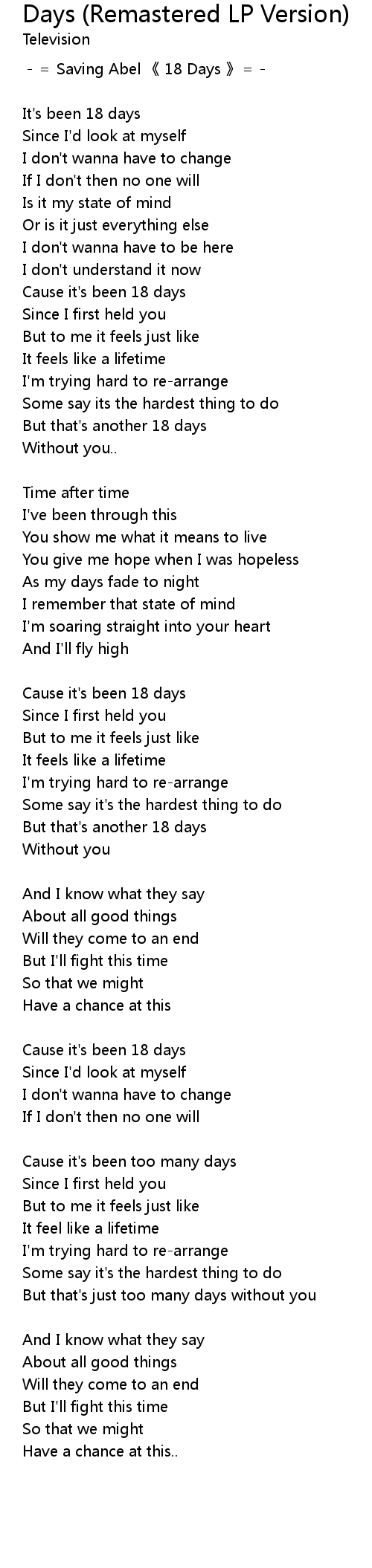 | Cause it' s been too many days | |