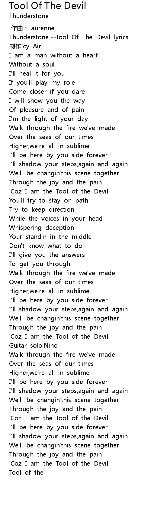 | [00:01.66] | Thunderstone --Tool Of The Devil lyrics |