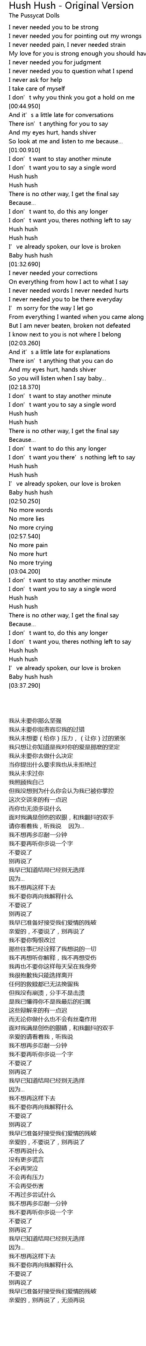 | [02:29.080] | Hush hush |