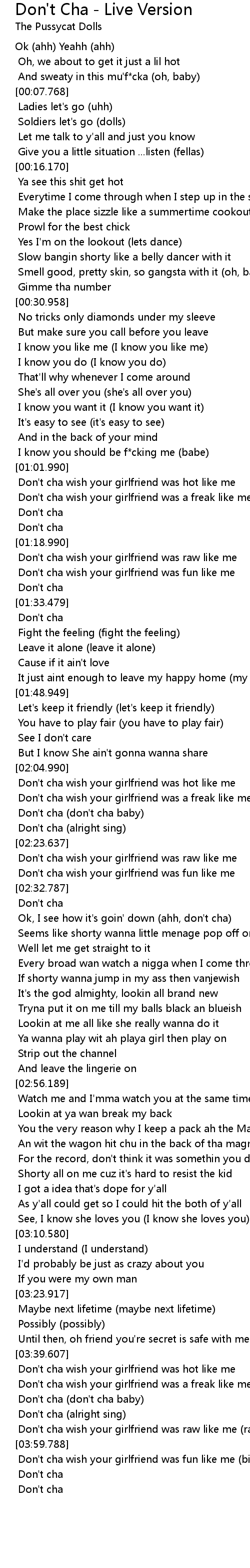 | [02:24.137] | Don' t cha wish your girlfriend was raw like me |