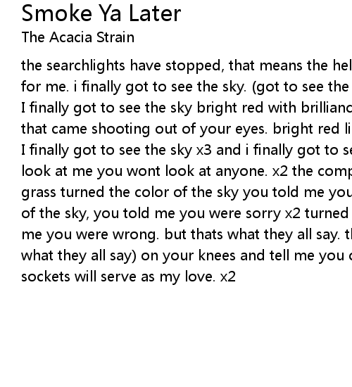 I finally got to see the sky x3 and i finally got to see the sky if you wont look at me you wont look at anyone. x2 the comparison is astounding. as the grass turned the color of the sky you told me you were sorry. turned the color of the sky, you told me you were sorry x2 turned the color of the sky you told me you were wrong. but thats what they all say. thats what they all say (thats what they all say) on your knees and tell me you can live without me. your empty sockets will serve as my love. x2 |