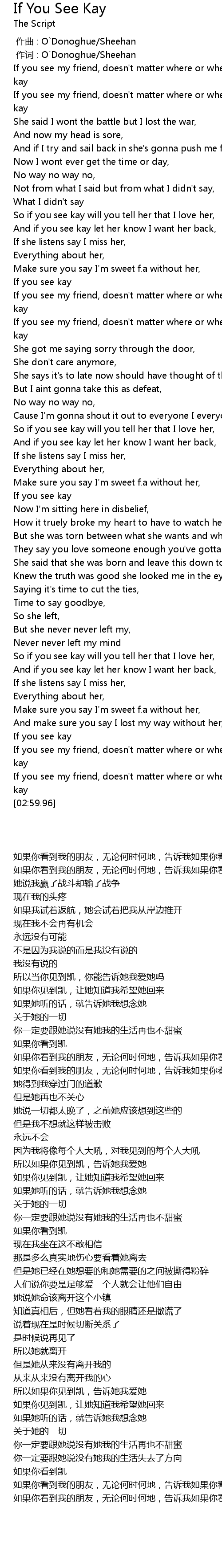 | [02:53.67] | If you see my friend, doesn't matter where or when, tell me if you see kay |