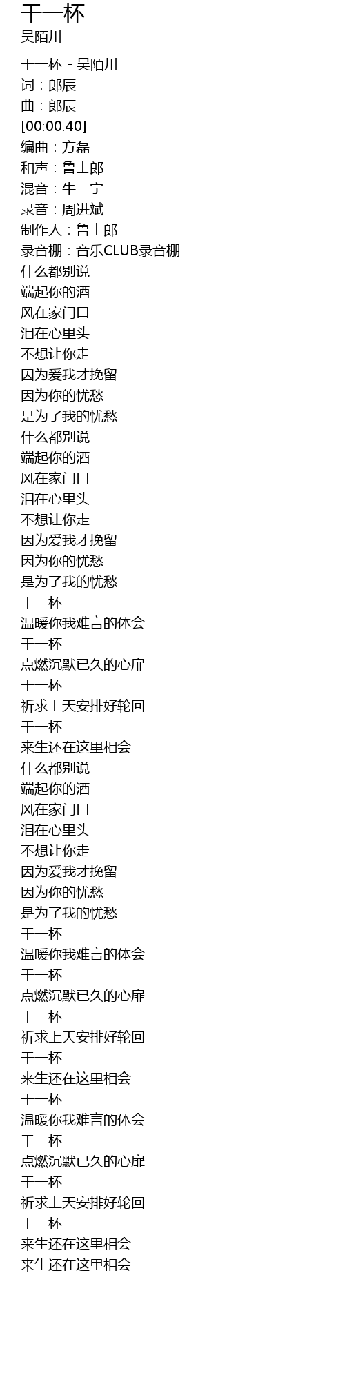 | [00:00.10] | 干一杯 - 吴陌川 |