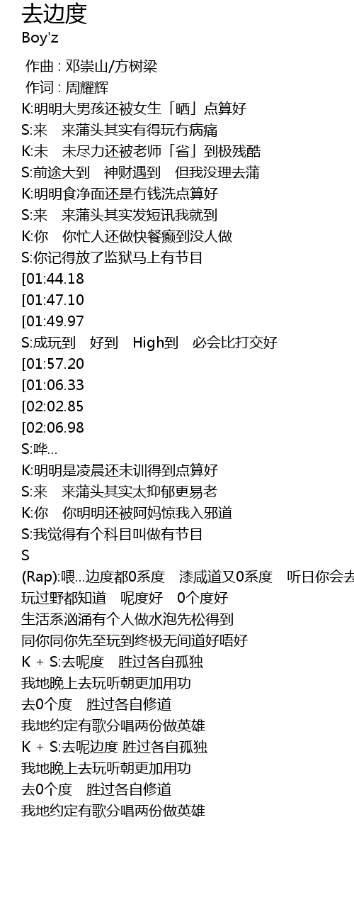 | [02:22.73] | S Rap: wei... bian du dou 0 xi du qi xian dao you 0 xi du ting ri ni hui qu bian du |