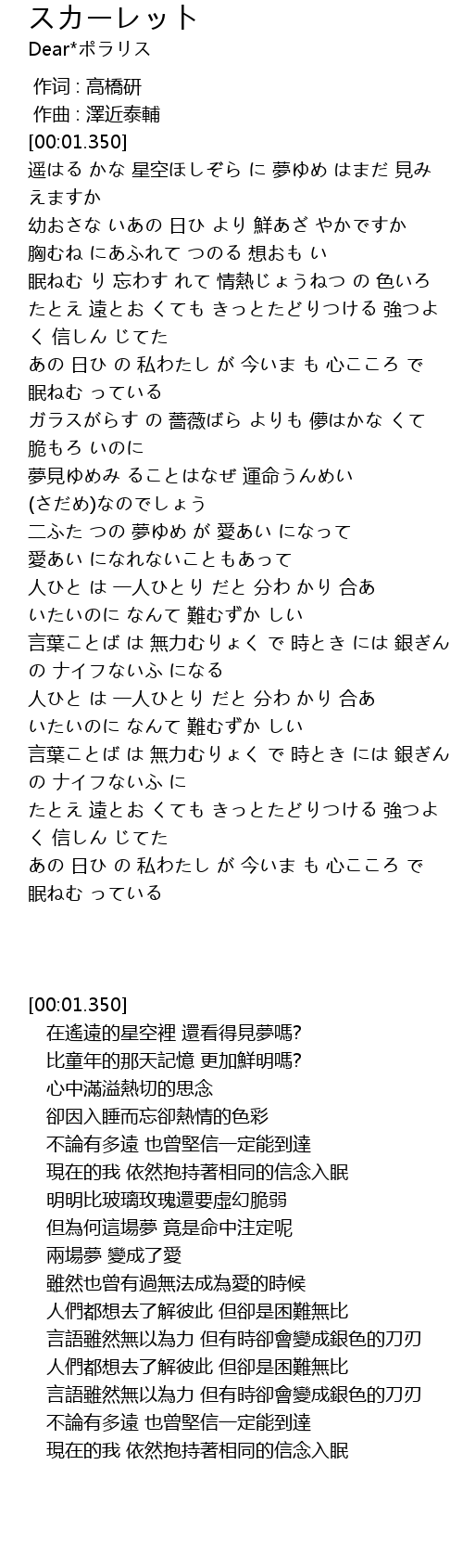 | [01:56.780] | 夢見ゆめみ ることはなぜ 運命うんめい (さだめ)なのでしょう |