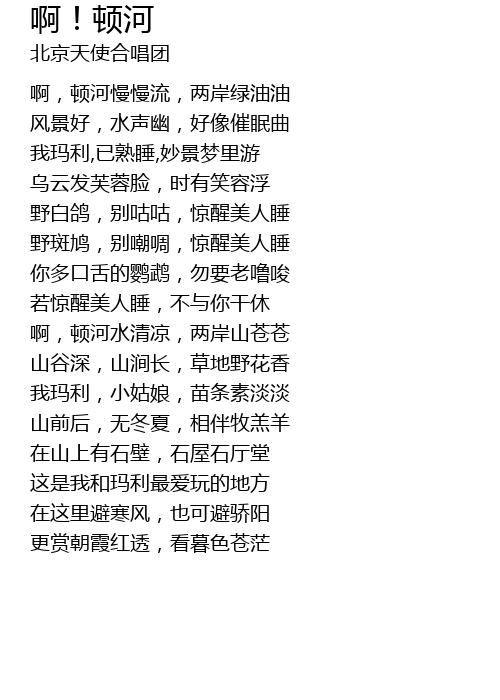 | [00:23.460] | a, dùn hé màn màn liú, liǎng àn lǜ yóu yóu |