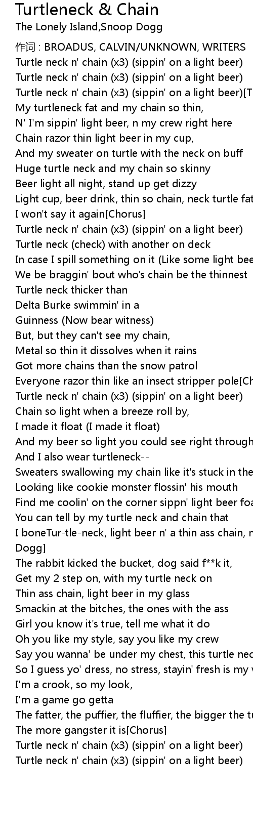| [Chorus]Turtle neck n' chain (x3) (sippin' on a light beer) | |