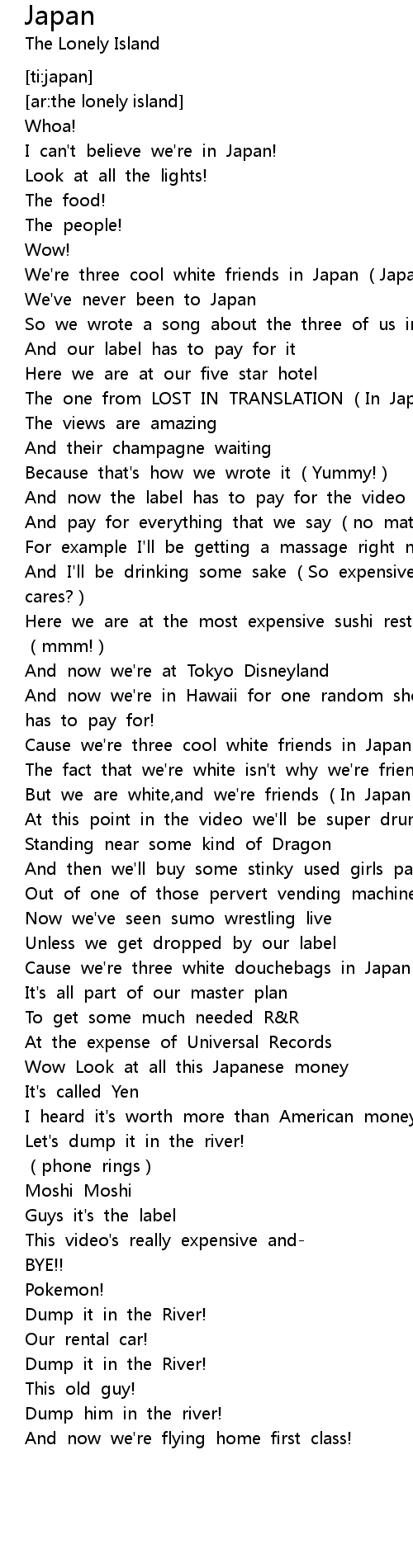 | [01:05.71] | Cause we're three cool white friends in Japan (In Asia!) |