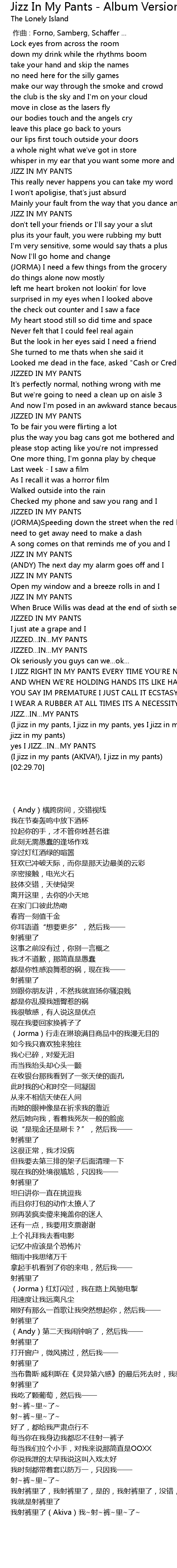 | [02:17.93] | (I jizz in my pants, I jizz in my pants, yes I jizz in my pants, yes I jizz in my pants) |