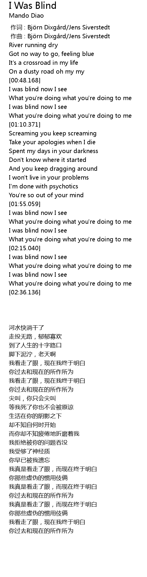 | [00:59.722] | I was blind now I see |