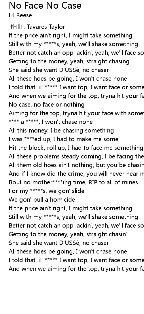 | [01:30.97] | I told that lil' ***** I want top, I want face or something |