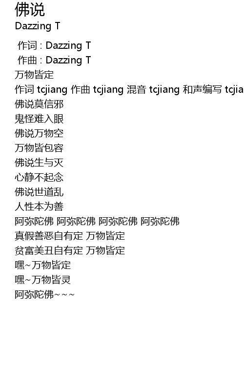 | [00:03.10] | 作词 tcjiang 作曲 tcjiang 混音 tcjiang 和声编写 tcjiang |