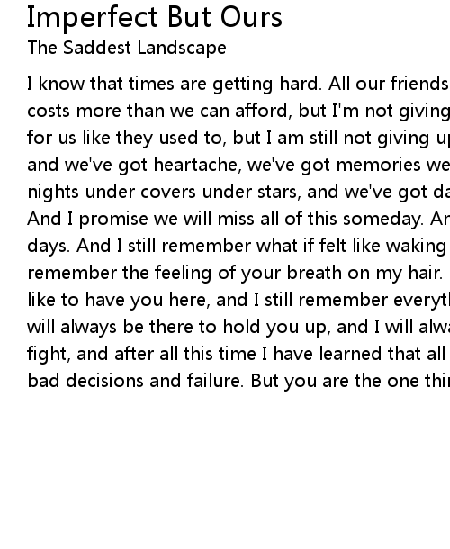 I know that times are getting hard. All our friends can't find jobs, and heat costs more than we can afford, but I'm not giving up. The clouds may never part for us like they used to, but I am still not giving up on us. We've got mixtapes and we've got heartache, we've got memories we haven't made yet. We've got nights under covers under stars, and we've got days that we never want to end. And I promise we will miss all of this someday. And I promise we will miss these days. And I still remember what if felt like waking next to you, and I still remember the feeling of your breath on my hair. I still remember what it felt like to have you here, and I still remember everything about our lives. And I will always be there to hold you up, and I will always forgive you when we fight, and after all this time I have learned that all those wishes lead to was bad decisions and failure. But you are the one thing that I got right. |