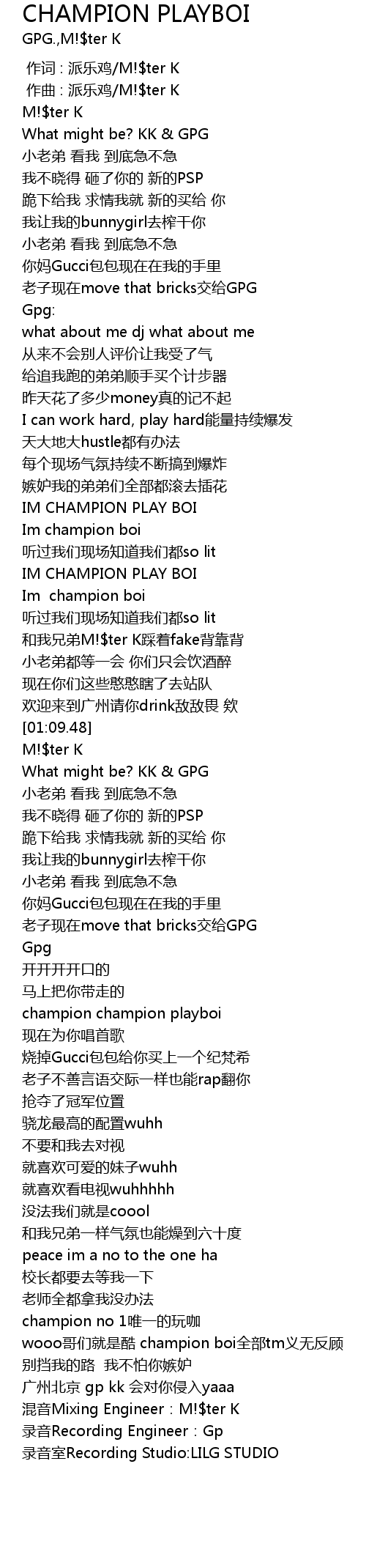 | [01:59.19] | wooo ge men jiu shi ku champion boi quan bu tm yi wu fan gu |