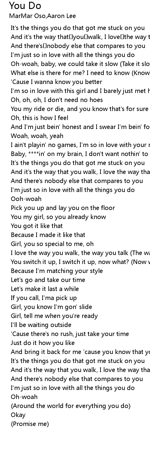 | [01:21.381] | It's the things you do that got me stuck on you |