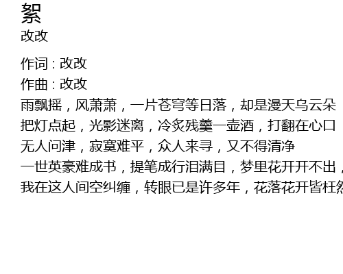 | 一世英豪难成书,提笔成行泪满目,梦里花开开不出,梦外愁肠满腹 | |