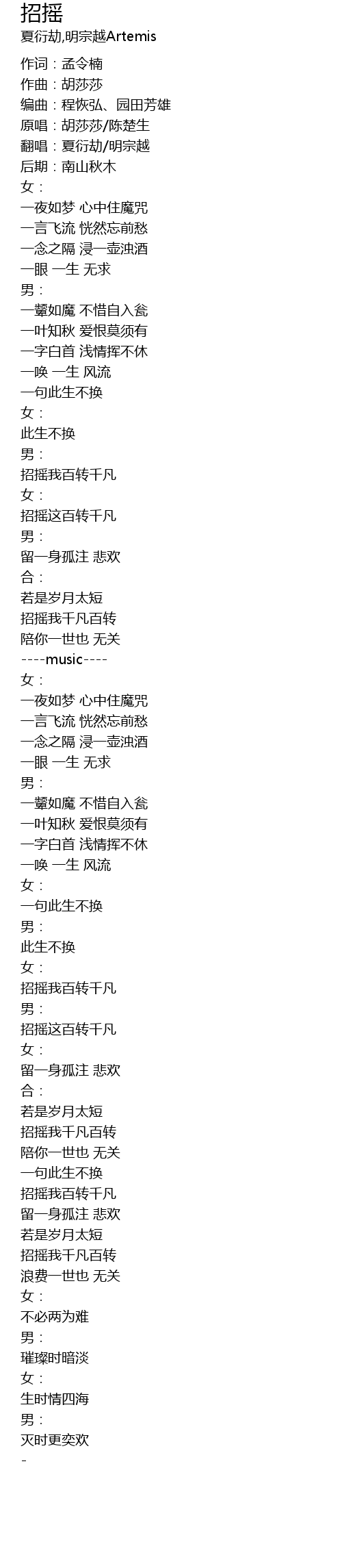 | [01:23.500] | zhāo yáo wǒ bǎi zhuǎn qiān fán |