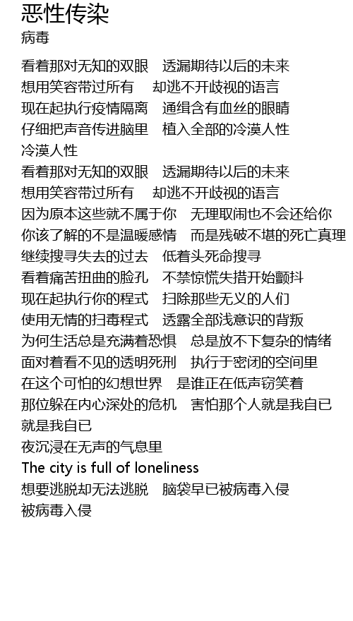 | [00:55.12] | 现在起执行疫情隔离 通缉含有血丝的眼睛 |